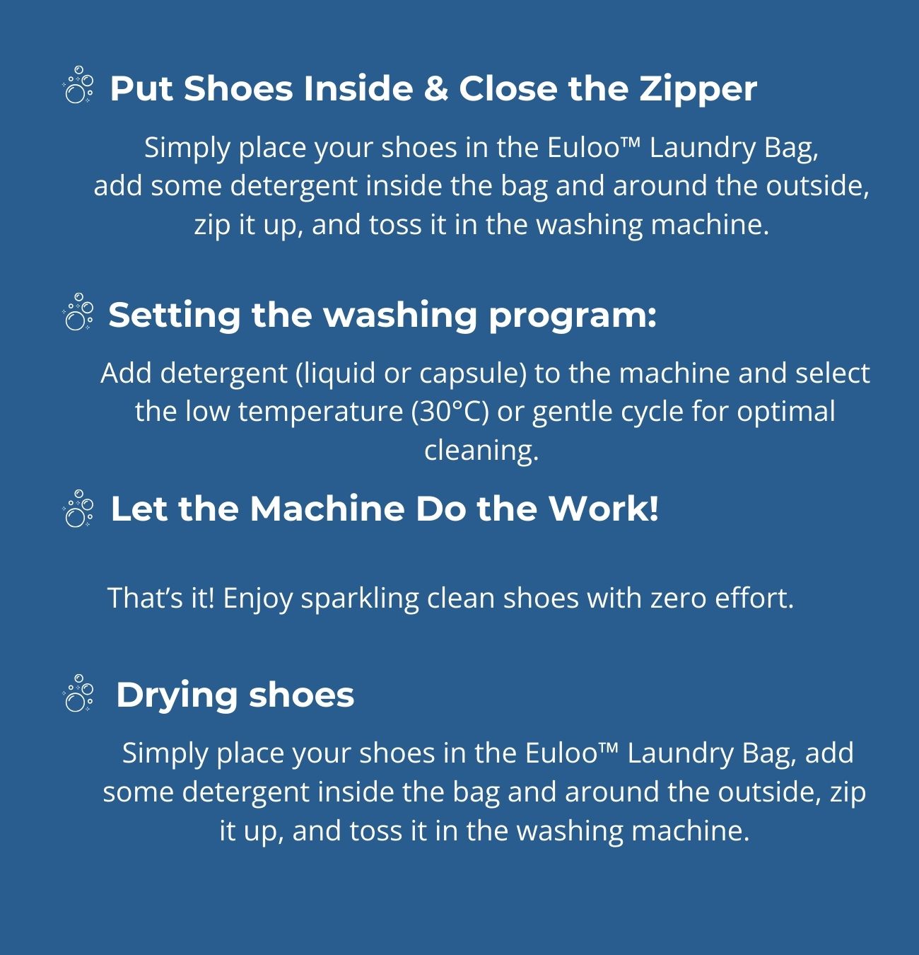 Euloo™ laundry shoe bag is the worlds first multi-layered wash bag with 1,000+ soft bristles, removing 99% of odors and stains in minutes - no damage . no mess, Keep your shoes looking fresh and new, effortlessly!